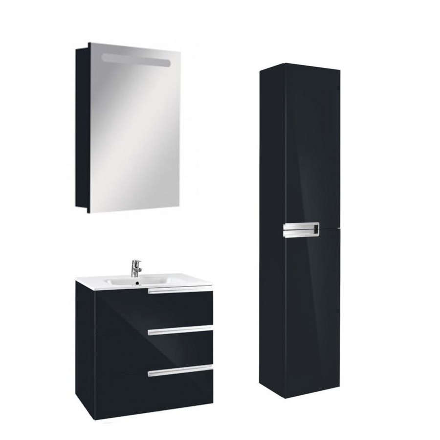 Зеркальный шкаф с полочками из коллекции Roca Victoria Nord в черной отделке, изготовлен из влагостойкого лаконаливного ДСП, снабжен механизмом мягкого закрывания двери производства BLUM (Австрия), встроенным светильником, крепежом к стене.