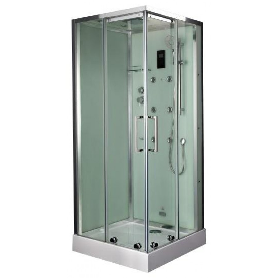 Душевая кабина BandHours Beta имеет квадратную форму, может быть как левосторонней, так и правосторонней. Поддон выполнен из акрила высочайшего качества производства Германии,имеющего свойство расширяться и сжиматься в зависимости от температуры воды, сохраняя свою форму. Высота его составляет 150 мм. Двери раздвижные, изготовлены из прозрачного противоударного стекла, имеющего толщину 6 мм, работают на системе двойных роликов "Easy sliding", дающих плавность скольжения при движении. Профиль выполнен из высококачественного алюминия новейших разработок. В комплектацию душевой кабины модели BandHours Beta входят 6 форсунок для гидромассажа всего тела. Имеется и интересная функция "тропический дождь", за счет особой подачи воды и соединения ее с воздухом, меняется структура, она становится более мягкой, как дождевая. Душевая кабина BandHours Beta для вашего удобства имеет два пульта управления: сенсорный и дистанционный. В комплектацию кабины входят зеркало и полочка для шампуня и мыла, а также вытяжка, внутренняя подсветка и радио. Очень интересная функция -"паровая баня". Находясь в собственной квартире, вы получите эффект нахождения в настоящей парилке.