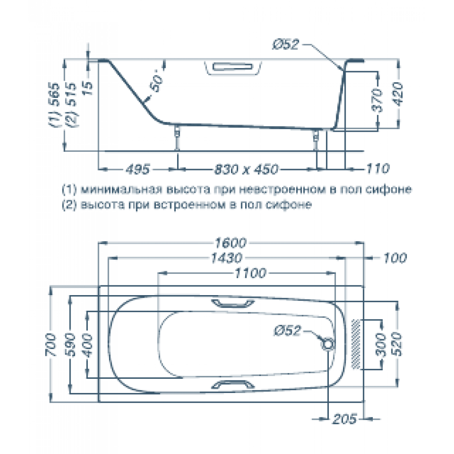 Чугунная ванна OXAME Olenne 160x70 с ручками