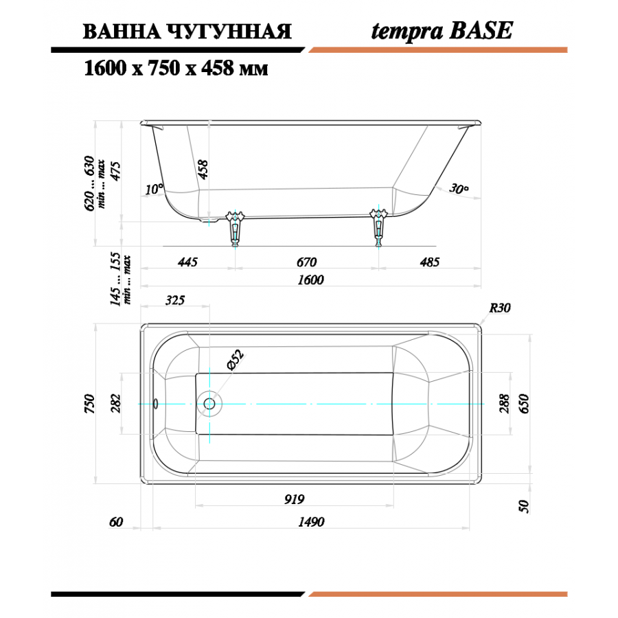 Чугунная ванна Tempra Base 160x75 квадратные ручки