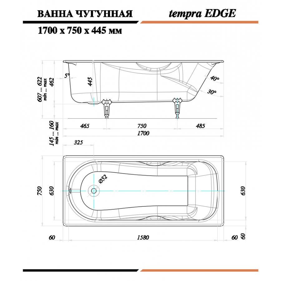 Чугунная ванна Tempra Edge 170x75. Ванны Tempra изготовлены из чугуна, а это самый лучший и прочный материал, поверхность покрыта в несколько слоев высококачественной титановой эмалью, такая ванна прослужит Вам очень долго. Модельный ряд Tempra предлагает широкий ассортимент, чтобы вы могли подобрать ту ванну, которая идеально дополнит пространство ванной комнаты.