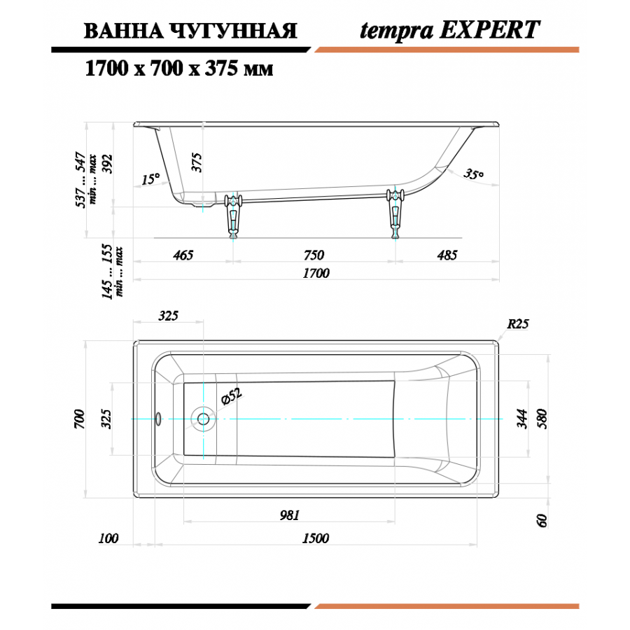 Чугунная ванна Tempra Expert 170x70 круглые ручки