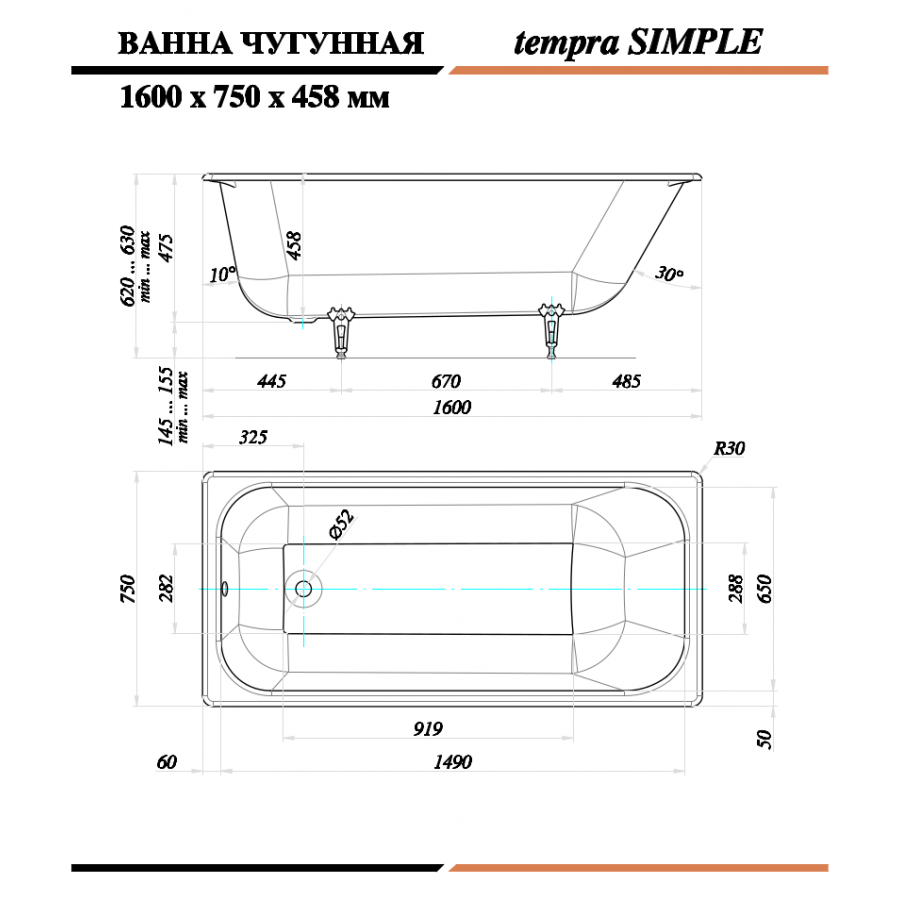 Чугунная ванна Tempra Simple 160x75. Ванны Tempra изготовлены из чугуна, а это самый лучший и прочный материал, поверхность покрыта в несколько слоев высококачественной титановой эмалью, такая ванна прослужит Вам очень долго. Модельный ряд Tempra предлагает широкий ассортимент, чтобы вы могли подобрать ту ванну, которая идеально дополнит пространство ванной комнаты.