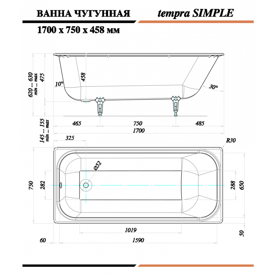 Чугунная ванна Tempra Simple 170x75 квадратные ручки