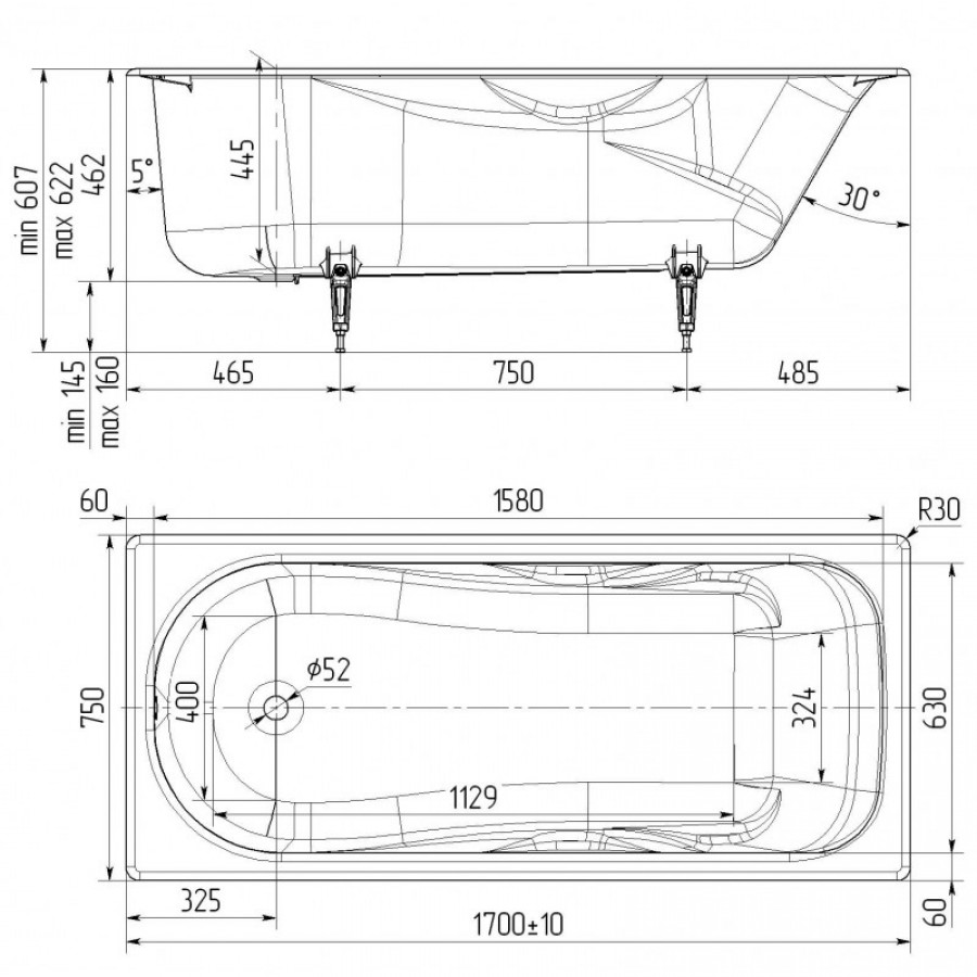 Чугунная ванна Универсал Сибирячка 170x75 с круглыми ручками