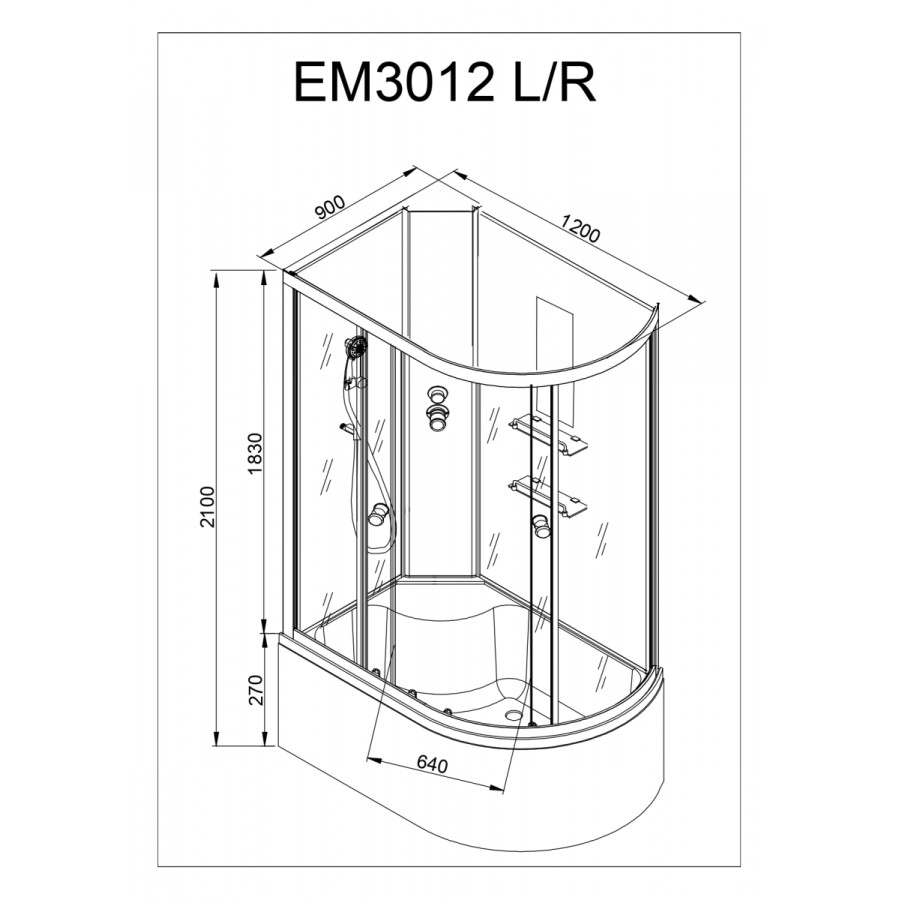Душевая кабина AvaCan EM3012LN с гидромассажем 120х90 – с оригинальным матовым рисунком на передних стеклах. Благодаря оцинкованному металлическому каркасу, поддон душевой кабины способен выдерживать большие нагрузки, а регулируемые ножки каркаса облегчают монтаж.