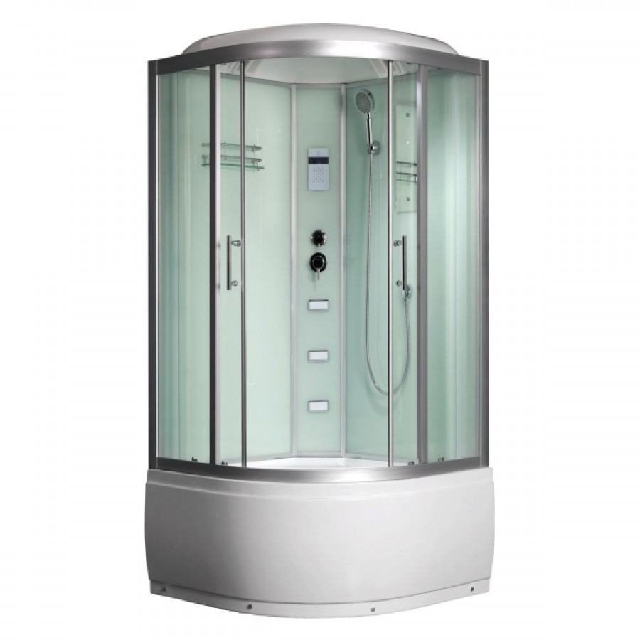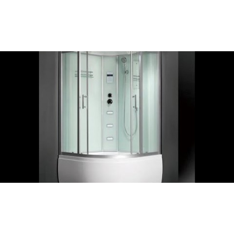 Полностью стеклянная угловая, полукруглая душевая кабина Frank F656 100x100 из закалённого (ESG) стекла с высоким подоном. Передние стёкла прозрачные, задние стёкла белые; толщина стёкол 6мм. На центральной стойке размещены сенсорный пульт управления душевой кабиной с дисплеем, 3 направленных форсунки, переключатель режимов, смеситель. Двери в кабине раздвижные, плавность хода которых гарантирована установленными на них двойными металическими роликами, а на торцах дверей установлены алюминиевые магнитные полосы для плотного закрывания душевой кабины. На задних стенках расположены полочка для фитокосметики, зеркало и трёх-позиционная душевая лейка с возможностью интенсивности массажа. В крышу вмонтирован большой верзний душ (тропический) и 2 LED лампы подсветки душевой кабины. Для недопущения переполнения поддона установлен слив-перелив.