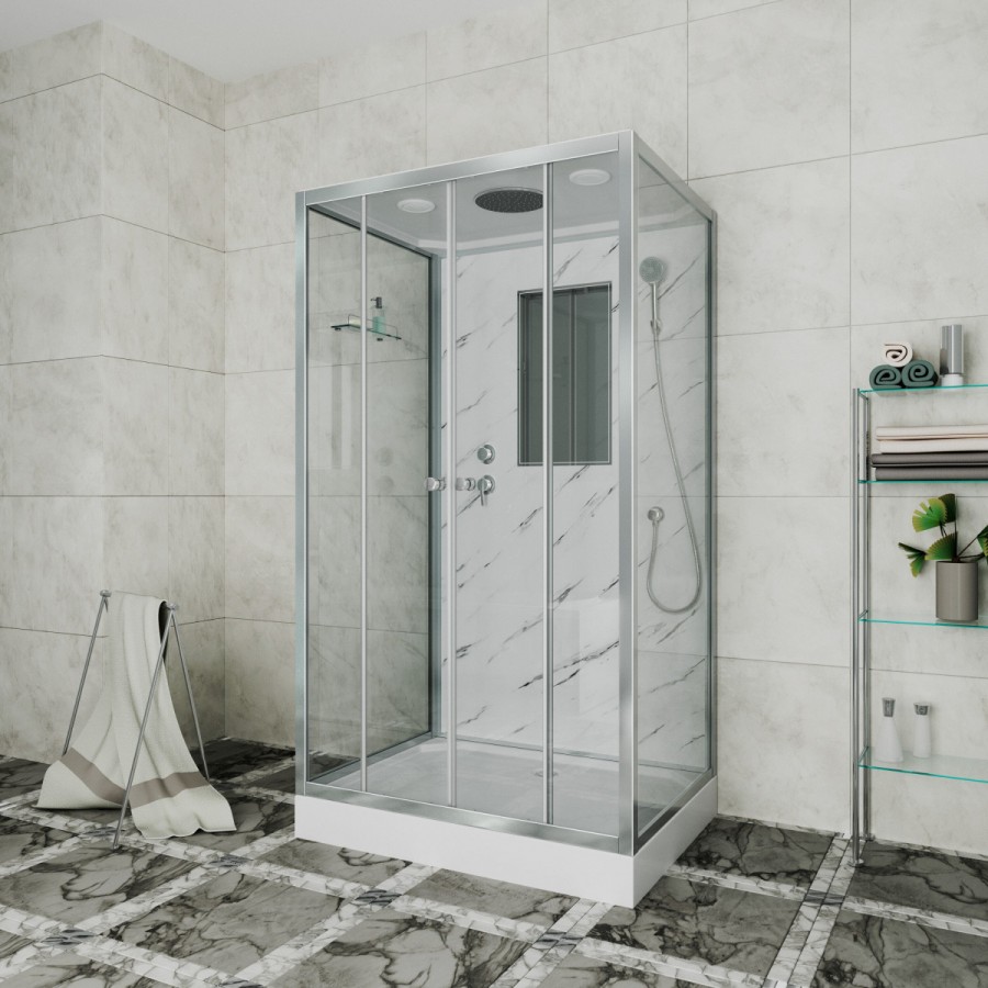 - Задние стенки каленое стекло, обрамленные в алюминиевый профиль, с рисунком белый мрамор.