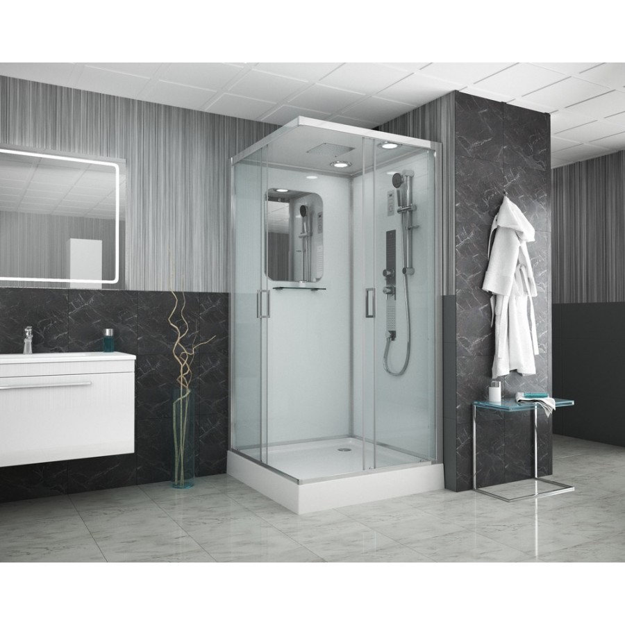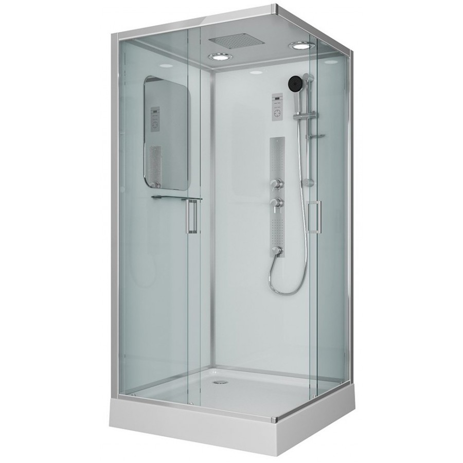 - Комплектация: сифон, тропический душ, шланг душа, штанга, полочка, зеркало, смеситель.