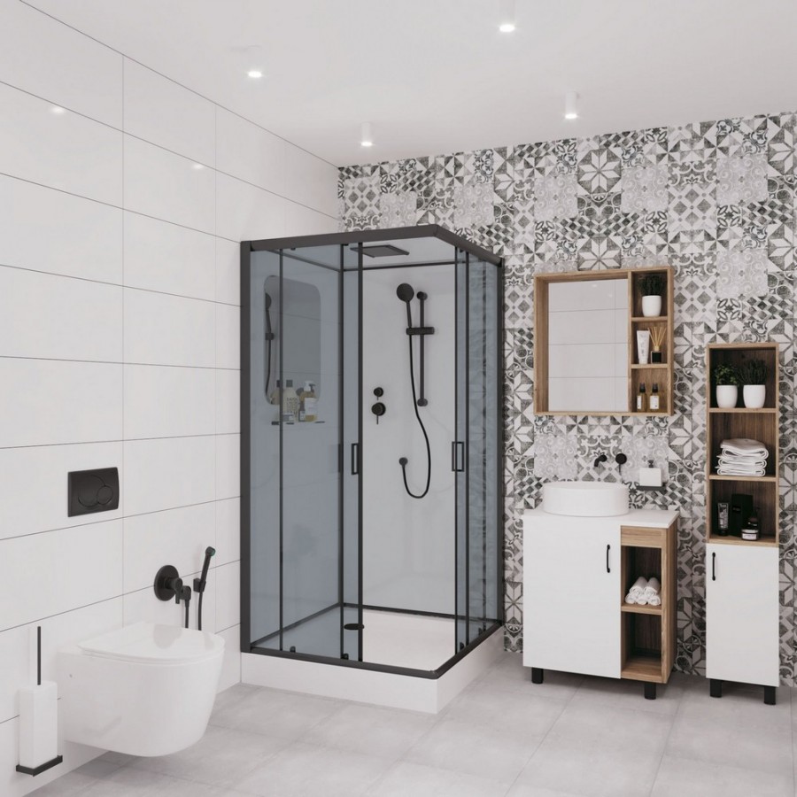 - Комплектация: сифон, тропический душ, шланг душа, штанга, полочка, зеркало, смеситель.