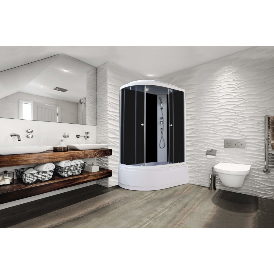 - Поддон: асимметричный, высокий 42 см. В высоком поддоне удобно купить детей и животных, замачивать вещи. Литое сиденье можно использовать как дополнительное место для хранения душевых принадлежностей.