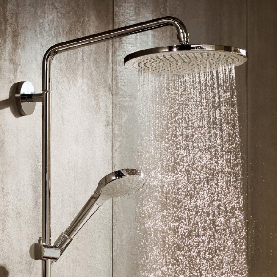 Тотальный дизайн душевой системы Hansgrohe в действии: все детали душевой системы – от пропорций ручного и верхнего душей до рисунка расположения форсунок на лейках – подчинены единой концепции в ультрамодном стиле Dynamic Organic.