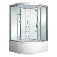 Душевой бокс Frank F651 130x130 угловой, полукруглый с 3-мя гидромассажными форсунками в кабине. Белые стеклянные задние стенки с вертикальным гидромассажем. Усиленная конструкция душевого бокса Frank - инновационное решение в соединении материалов – дополнительная устойчивость и жесткость при интенсивной эксплуатации.