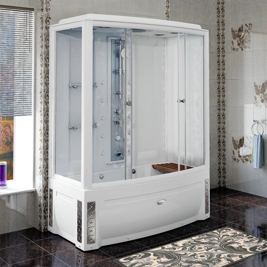 - чаша ванны, рама-подставка, слив-перелив полуавтоматический, фронтальная панель, торцевая панель, боковая стенка, задняя стенка, крыша, стеклянные шторки, стандартный гидромассаж (6 форсунок по периметру, 3 форсунки спинного массажа, регулятор подачи воздуха, контроллер), контроллер 300, функция «Пар», FM-приёмник, освещение, динамик - 2 шт., вентилятор вытяжки, озоновая дезинфекция, 10 форсунок горизонтального душа, вертикальный душ «Тропический дождь», 4-х позиционный смеситель, излив, сиденье, 2 стеклянные полочки, ручной душ, молдинг, профиль белый