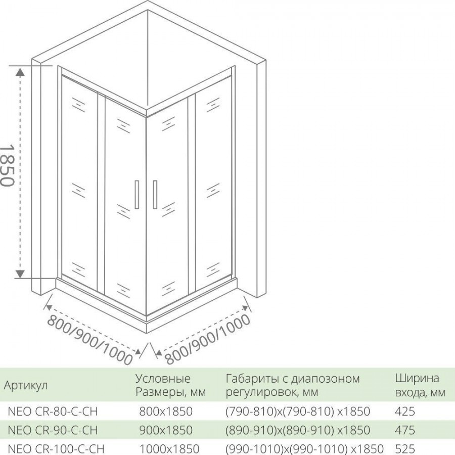 Душевой уголок Good Door Neo CR-80-C-CH 80x80. Квадратный душевой уголок с двумя раздвижными дверьми. Нижние ролики с механизмом отстегивания обеспечивает доступ к стеклу для очистки. Стыковые элементы стеклянного ограждения снабжены влагостойкими силиконовыми уплотнителями.