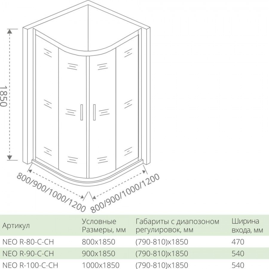 Душевой уголок Good Door Neo R-100-C-CH 100x100. Радиусный душевой уголок с двумя раздвижными дверьми. Нижние ролики с механизмом отстегивания обеспечивает доступ к стеклу для очистки. Стыковые элементы стеклянного ограждения снабжены влагостойкими силиконовыми уплотнителями.