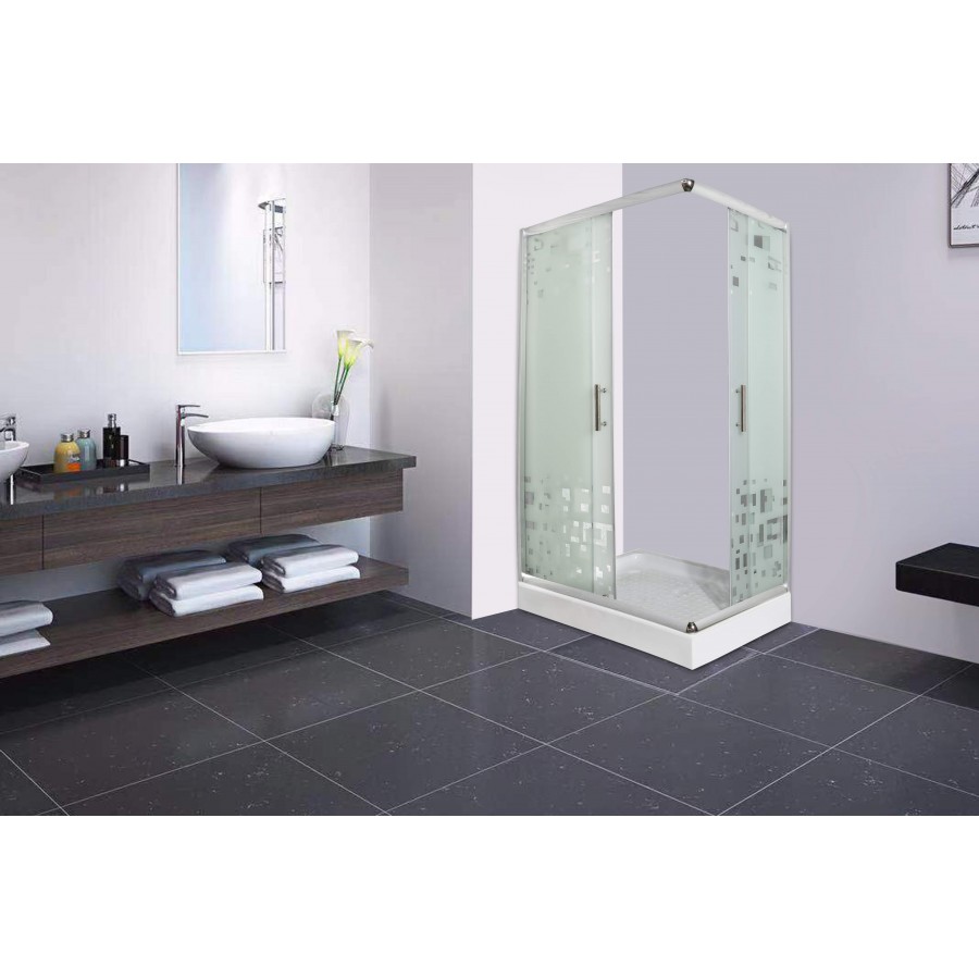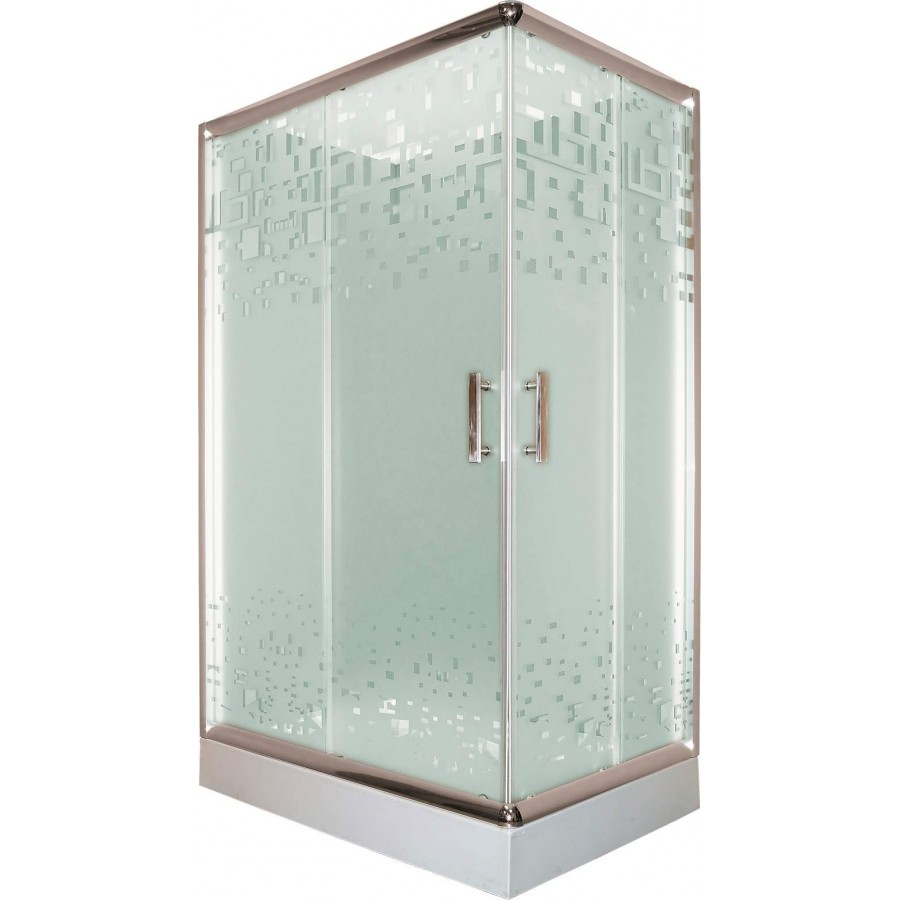 Душевое ограждение, низкий прямоугольный поддон , стекла матовые с рисунком 6 мм, металлические ролики, хромированный профиль, слив