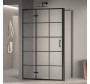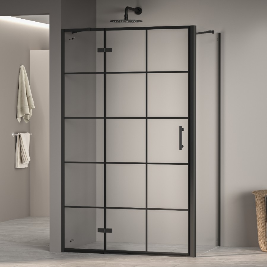 Эффектная распашная дверь в обрамлении черного алюминиевого профиля дополнена оцинкованными петлями в цвет. Обратите внимание, что петли у данного уголка находятся слева, а около неподвижной части удобно установить место для умывания, мебель для хранения или технику.