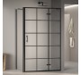 Эффектная распашная дверь в обрамлении черного алюминиевого профиля дополнена оцинкованными петлями в цвет. Обратите внимание, что петли у данного уголка находятся слева, а около неподвижной части удобно установить место для умывания, мебель для хранения или технику.