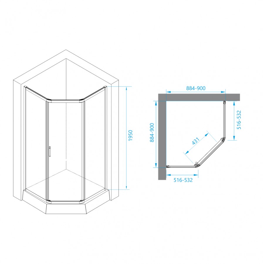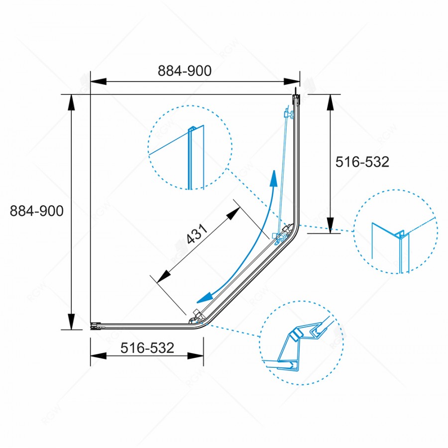 Высокопрочное закалённое стекло, обладает устойчивостью к резким перепадам температуры. Обработка стекла по технологии «Антикапля» - Easy Clean, позволит значительно облегчить уход и защитить стекло от известкового налёта. Профиль: анодированный алюминий с защитой от окисления и коррозии. Наличие ПВХ уплотнителей, магнитного замка и высокого профиля на нижнем уровне, позволяет достичь 100% герметичности в процессе использования. Двойные регулируемые ролики на верхнем уровне, обеспечат тихий ход двери. Двойные отстёгивающиеся ролики на нижнем уровне. Откидная дверка позволяет с лёгкостью поддерживать гигиену. Регулировка ширины изделия с помощью пристенного профиля до 20 мм, позволяет нивелировать уровни вертикали стен. Универсальная установка позволяет установить изделие в правый или левый угол, при монтаже можно выбрать направление открывания двери. Данная модель душевого угла совместима только с поддоном RGW LUX/TN-TR.