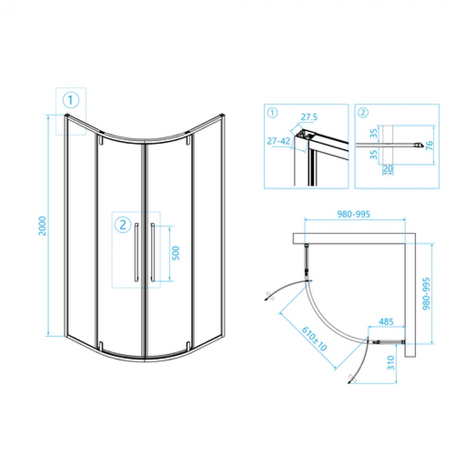 Душевой уголок полукруглый с двумя поворотными дверцами. Поворотный стержень (петля) из нержавеющей стали. Двойные ручки из нержавеющей стали 50 см. Прочное стекло рассчитано на активное использование и покрыто специальным защитным покрытием Easy Clean, которое избавит вас от борьбы с известковым налетом.