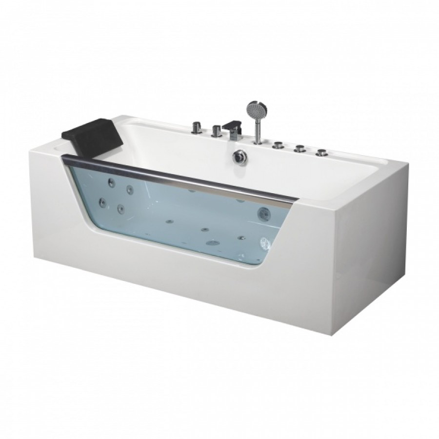 Гидромассажная ванна Frank F103 пристенная, прямоугольная с аэро- и гидромассажем. В боковой стенке установлен многоцветный подводный фонарь. Также ванна снабжена системой дезинфекции. Форсунки раположены в ванне с учётом эргономики тела и способствуют максимальному охвату поверхности тела при работе аэро- и гидромассажных двигателей. Лицевая стенка изготовлена из 10мм закалённого стекла.