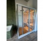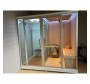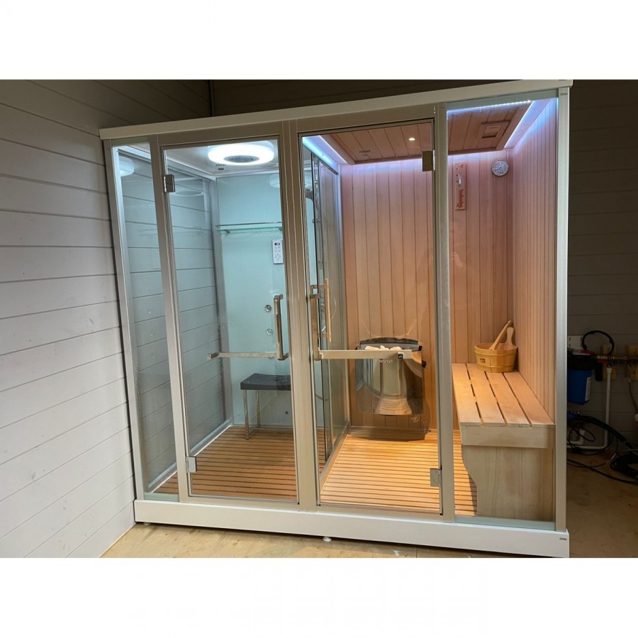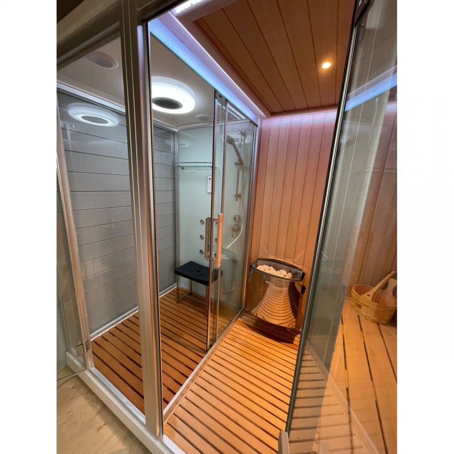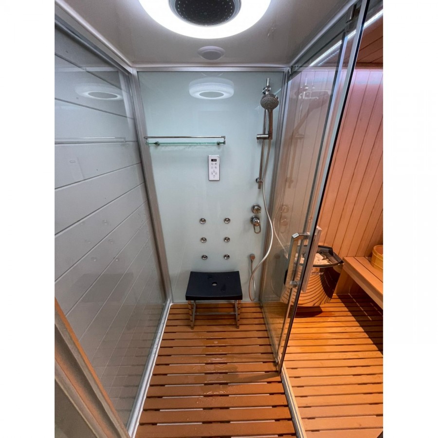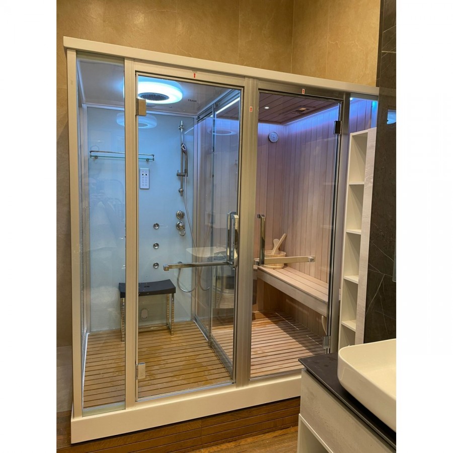 Сауна Frank F-918 R 180x130 - это душевая кабина, совмещённая с финской сауной. В общем боксе находятся сразу два отделения: одно с финской сауной, другое — с душем. Между отделениями есть дверь, через которую можно пройти, непосредственно, во время процедур. Стенки и двери кабины выполнены из закаленного ударопрочного стекла, а профиля конструкции из высокопрочного алюминия. В отделении сауны находится лавочка из кедра, деревянный настил с сифоном.
