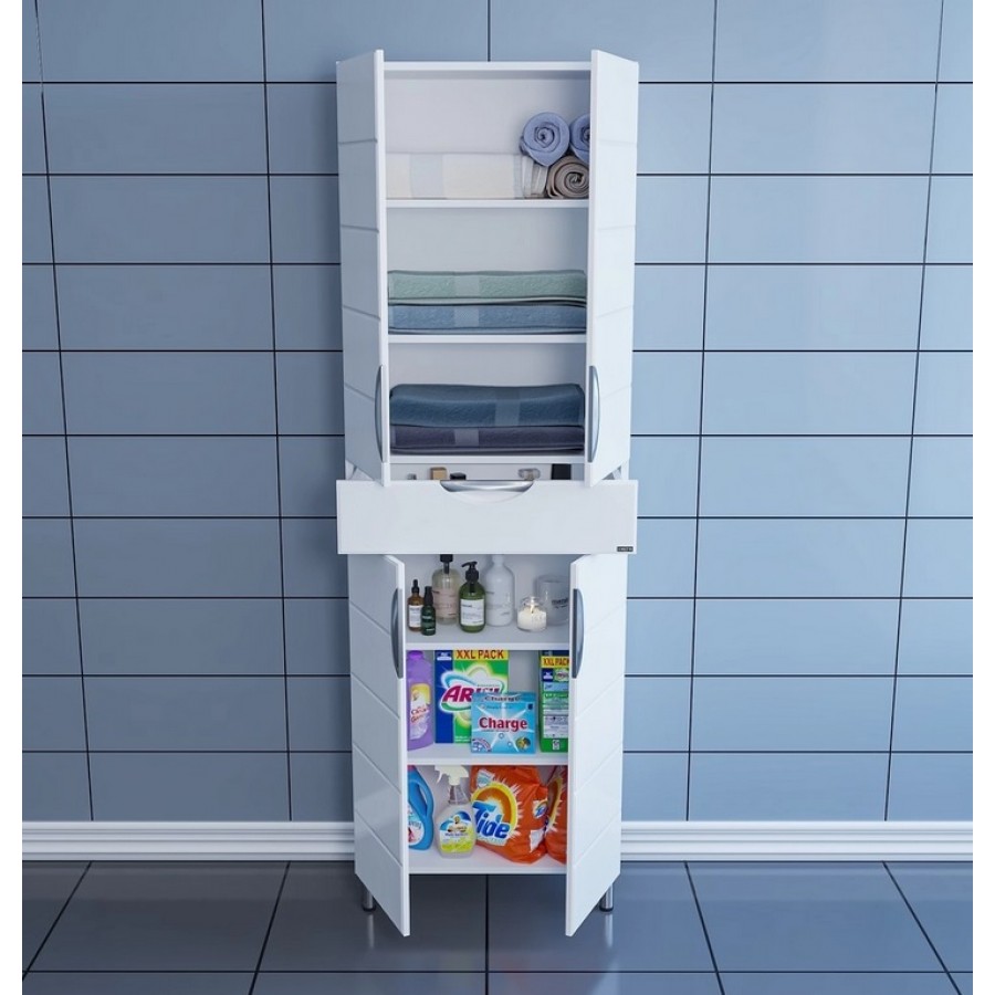 Шкаф-пенал СанТа Родос превосходно впишется в интерьер ванной комнаты. Прямые горизонтальные линии на фасаде визуально расширяют комнату. Мебель изготовлена из высококачественной МДФ, ламинированной глянцевой пленкой ПВХ для защиты от агрессивных воздействий внешней среды - влажности и температуры. Места для хранения - это пять полок и вместительный ящик. Петли с доводчиками на дверцах и направляющие полного выдвижения гарантируют плавное открывание, а ножки с пластиковыми основаниями не царапают напольное покрытие.