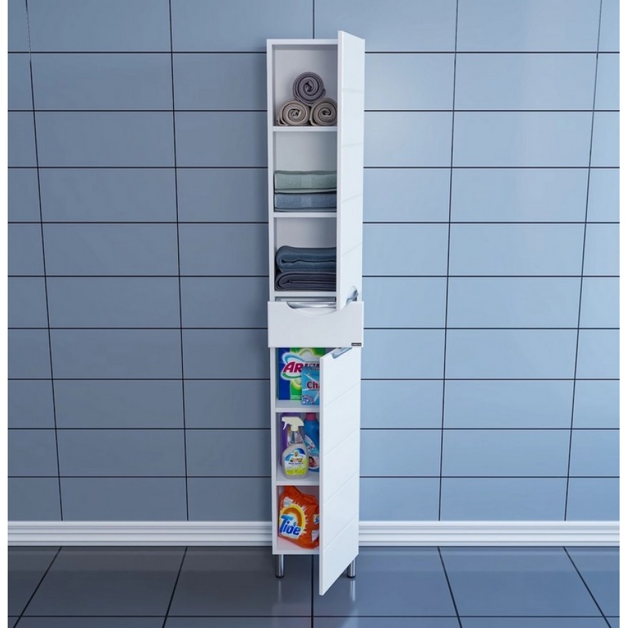 Шкаф-пенал СанТа Родос превосходно впишется в интерьер ванной комнаты. Прямые горизонтальные линии на фасаде визуально расширяют комнату. Мебель изготовлена из высококачественной МДФ, ламинированной глянцевой пленкой ПВХ для защиты от агрессивных воздействий внешней среды - влажности и температуры. Места для хранения - это пять полок и вместительный ящик. Петли с доводчиками на дверцах и направляющие полного выдвижения гарантируют плавное открывание, а ножки с пластиковыми основаниями не царапают напольное покрытие.
