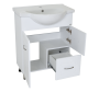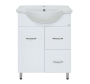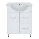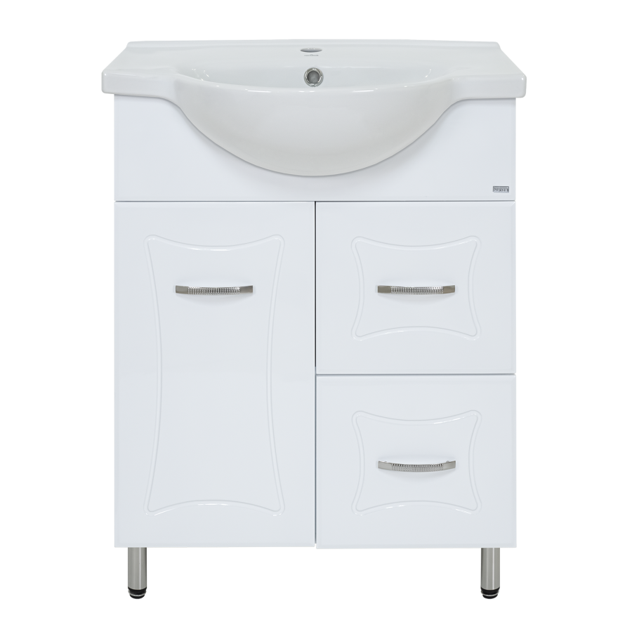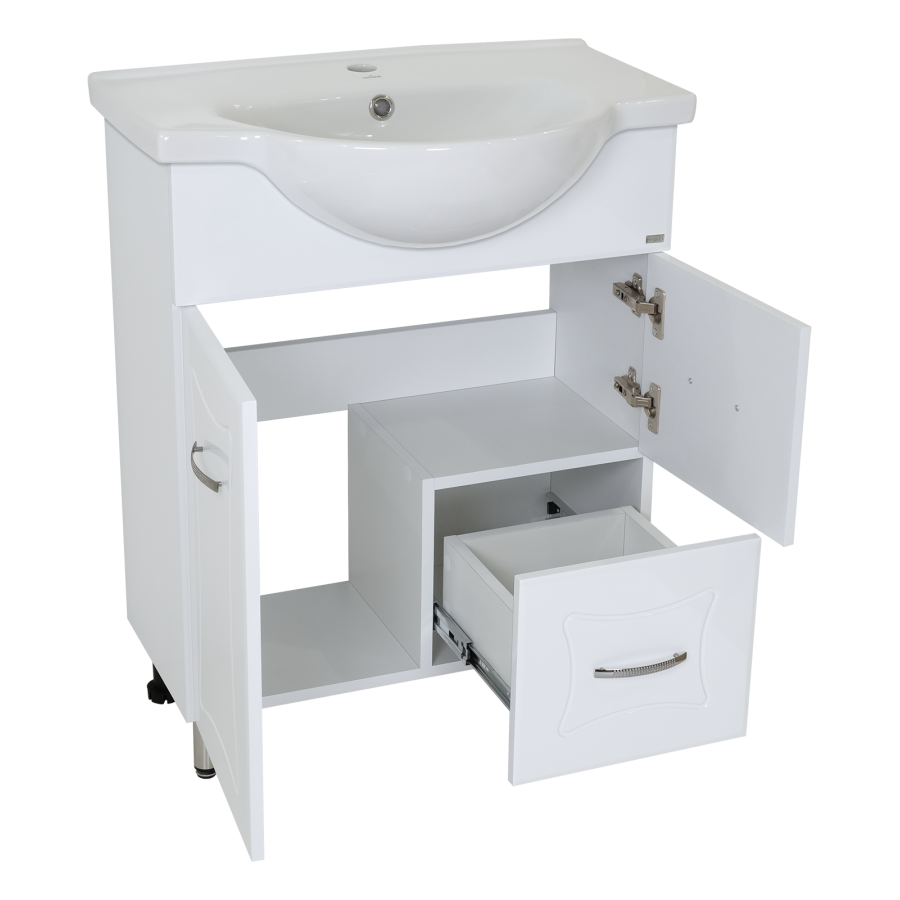 Усовершенствованная конструкция модели напольной тумбы с раковиной Классик 65, оборудованная выдвижным ящиком и двумя нишами с дверцами, поможет вам распределить ваши ванные принадлежности максимально удобно и практично. Модель выполнена в классическом белом цвете и дополнена оригинальным геометричным рисунком-фрезеровкой, который добавляет изделию особой индивидуальности. Тумба устанавливается на хромированные ножки и идёт в комплекте с керамической раковиной.