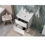 Тумба под раковину позволяет использовать мебель Oleta даже в небольших ванных комнатах. Несмотря на компактную глубину, тумба комплектуется раковиной Oleta с достаточно вместительной чашей. Лаконичный и современный дизайн раковины притягивает к себе взгляд. 2 выдвижных ящика тумбы установлены на направляющие HETTICH, которые гарантируют продолжительную безупречную функциональность и максимальный комфорт эксплуатации. Скрытый монтаж не портит элегантный дизайн мебели, а возможность полного выдвижения обеспечит быстрый доступ к необходимым предметам. Внутренняя отделка ящиков выполнена в цвете бежевый текстиль, приятна на ощупь и предотвращает скольжение предметов. Профильная ручка во всю ширину фасада удобна в использовании и позволяет сочетать мебель Oleta c различными цветами смесителей и аксессуаров для ванной комнаты. Ручка выполнена в виде J-профиля.