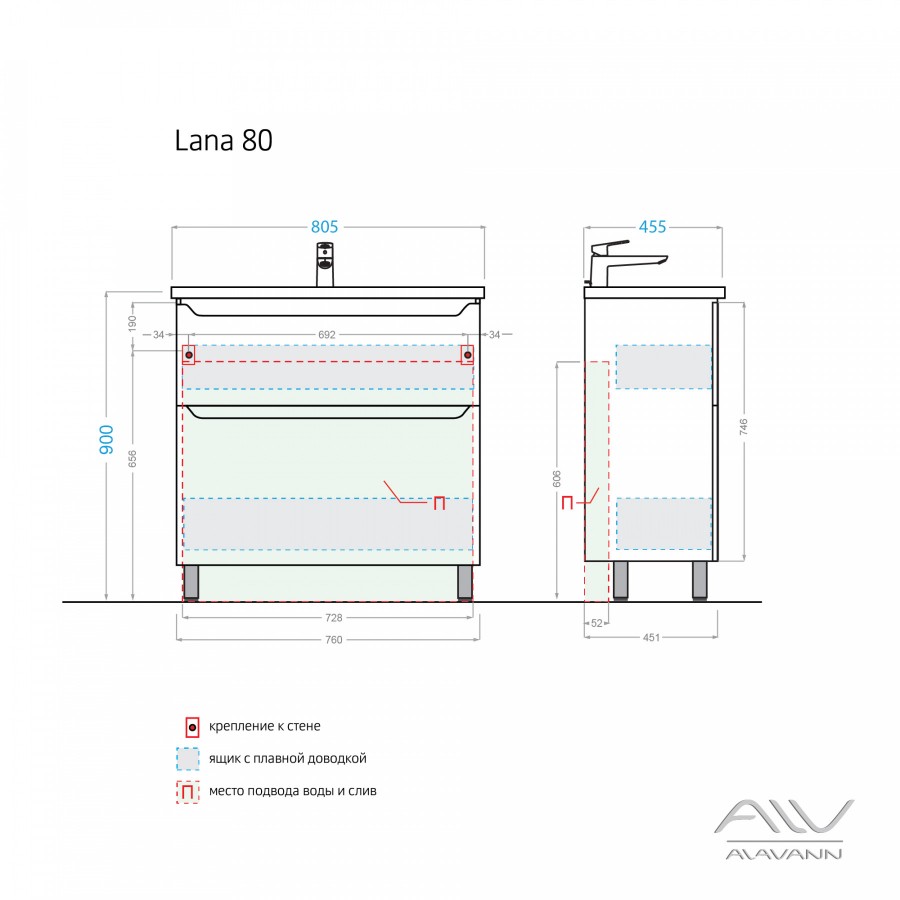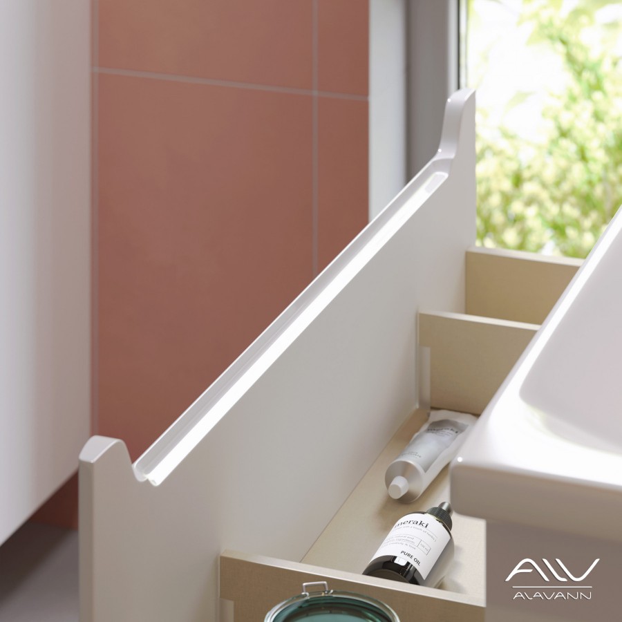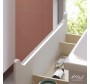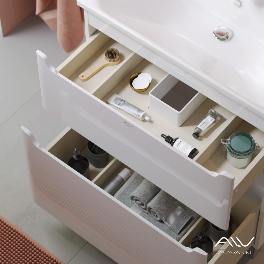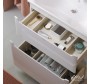 Компактная ширина изделия позволяет разместить тумбу для раковины в небольших помещениях. Верхний ящик скрыт за общим фасадом на направляющих с механизмом push-to-open. Нижний ящик на направляющих «Hettich» с доводчиками, позволяет комфортно доставать хранящиеся там предметы.