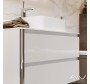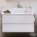 Подвесная тумба в ванную выполнена из качественных материалов. Для изготовления корпуса применяется влагостойкая ЛДСП. Фасады и боковые стенки выполнены из прочной МДФ, крашенной белой глянцевой эмалью. Ширина тумбы ( размер 100 ) позволяет разместить возле мойки банные принадлежности (полотенце, косметические средства и т.д.). Красиво смотрится столешница из искусственного камня, в которую врезается умывальник.