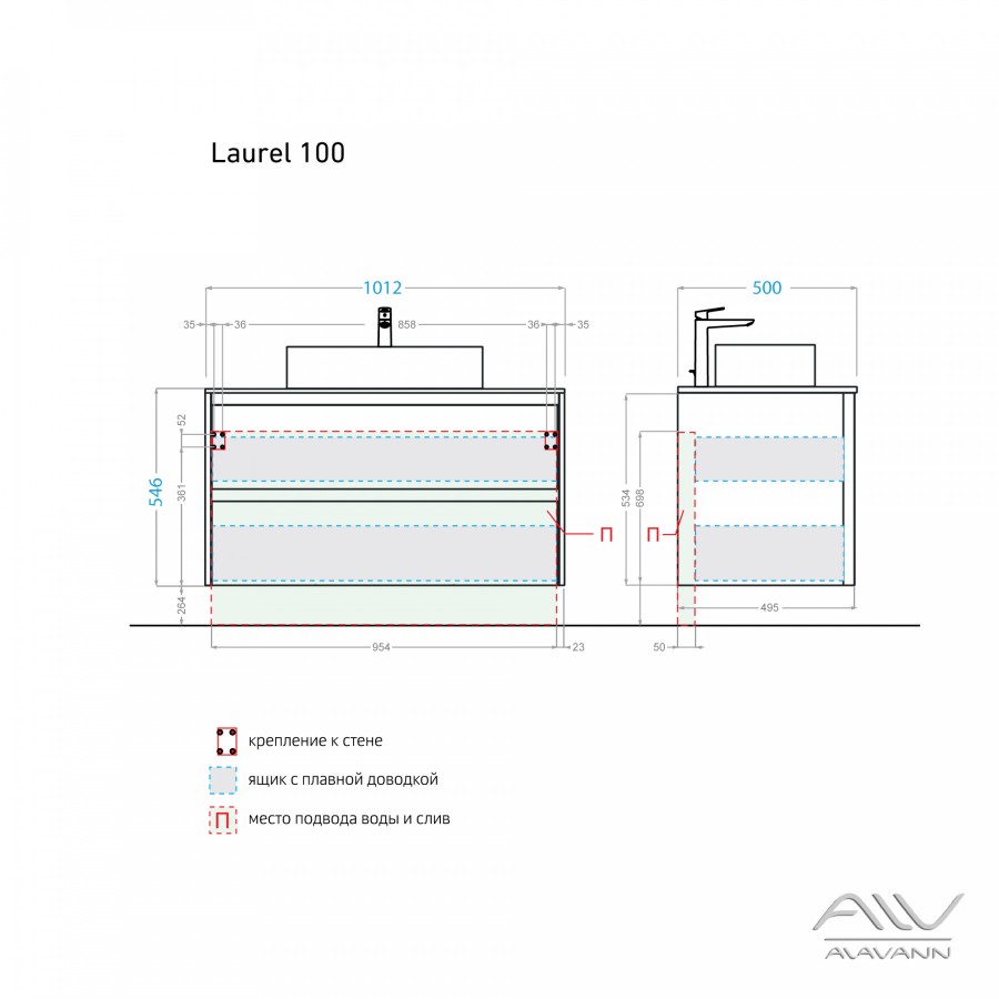 Тумба с раковиной Лаурель 100 монтируется при помощи усиленных навесов, гарантирующих безопасную эксплуатацию мебели.