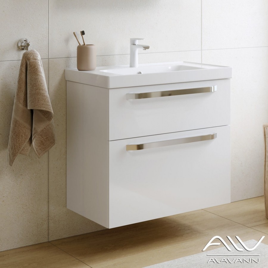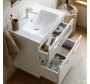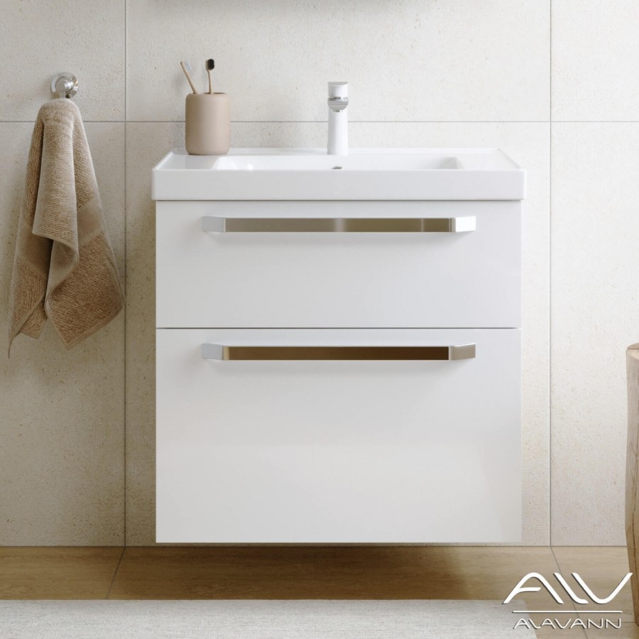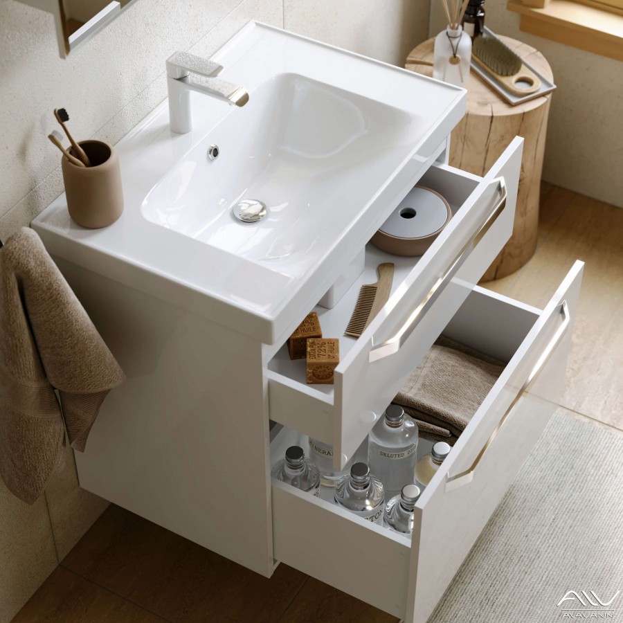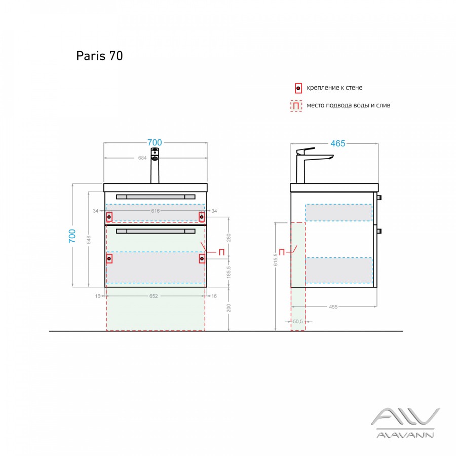 Современная тумба с раковиной Paris 70см (размер 70 – ширина) сочетает в себе отменное качество, утонченный дизайн и отличную функциональность. Корпус и боковые стенки выполнены из влагостойкой ЛДСП. Для изготовления фасада применяется ламинированная МДФ в белой ПВХ пленке, устойчивой к истиранию.