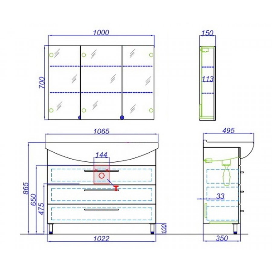 Тумба с умывальником AQWELLA Аллегро 105 три ящика Agr.01.10/3