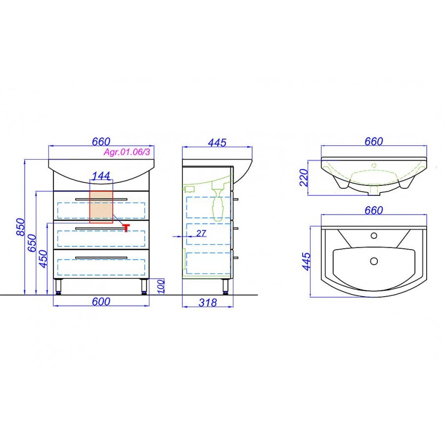 Тумба с умывальником AQWELLA Аллегро 65 три ящика Agr.01.06/3