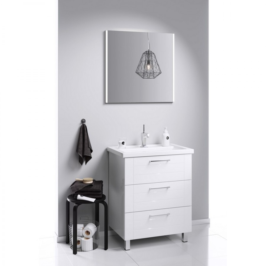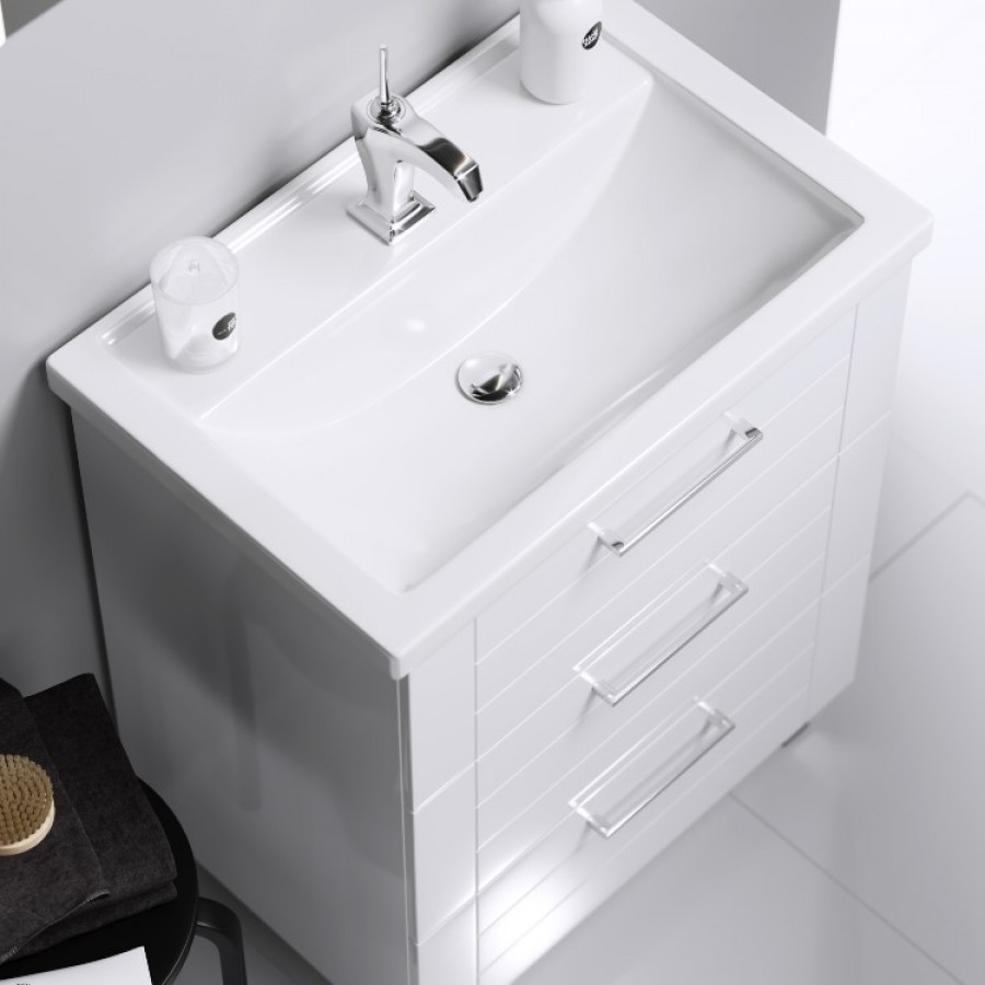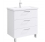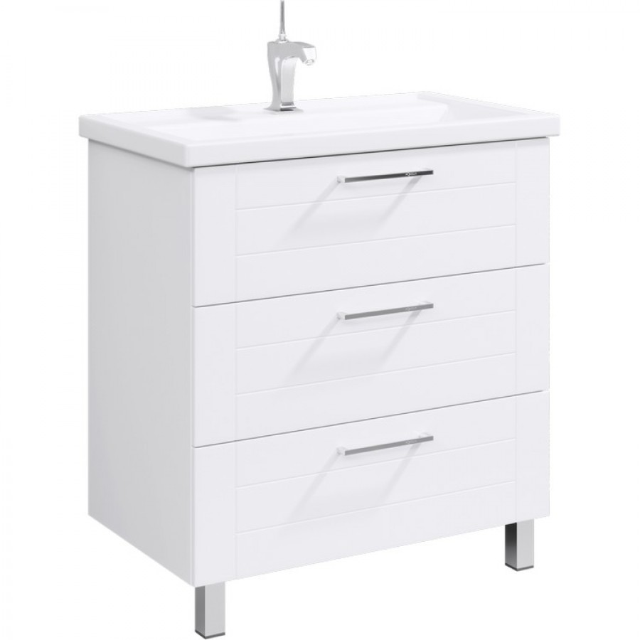 Тумба с умывальником AQWELLA MANCHESTER с тремя выдвижными ящиками с хромированными ручками для стильного интерьера. Это гармония, удобство и функциональность. Материал фасада из МДФ, стенки покрыты пятью слоями белой глянцевой эмали, материал корпуса - ЛДСП. Ящики оснащены скрытыми направляющими австрийского бренда Blum с системой мягкого закрывания. Гарнитур комплектуется керамическими умывальниками от российской компании Kirovit.