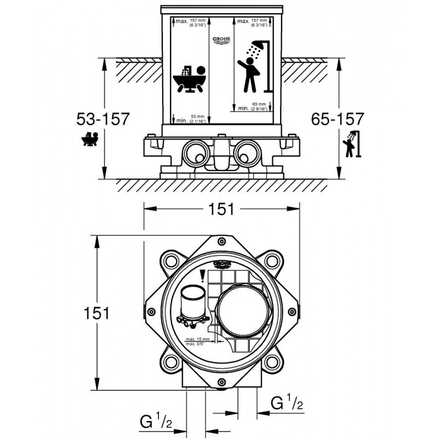 - Инсталляционная глубина для смесителей для душа 65-157 мм, компенсационная глубина 92 мм.